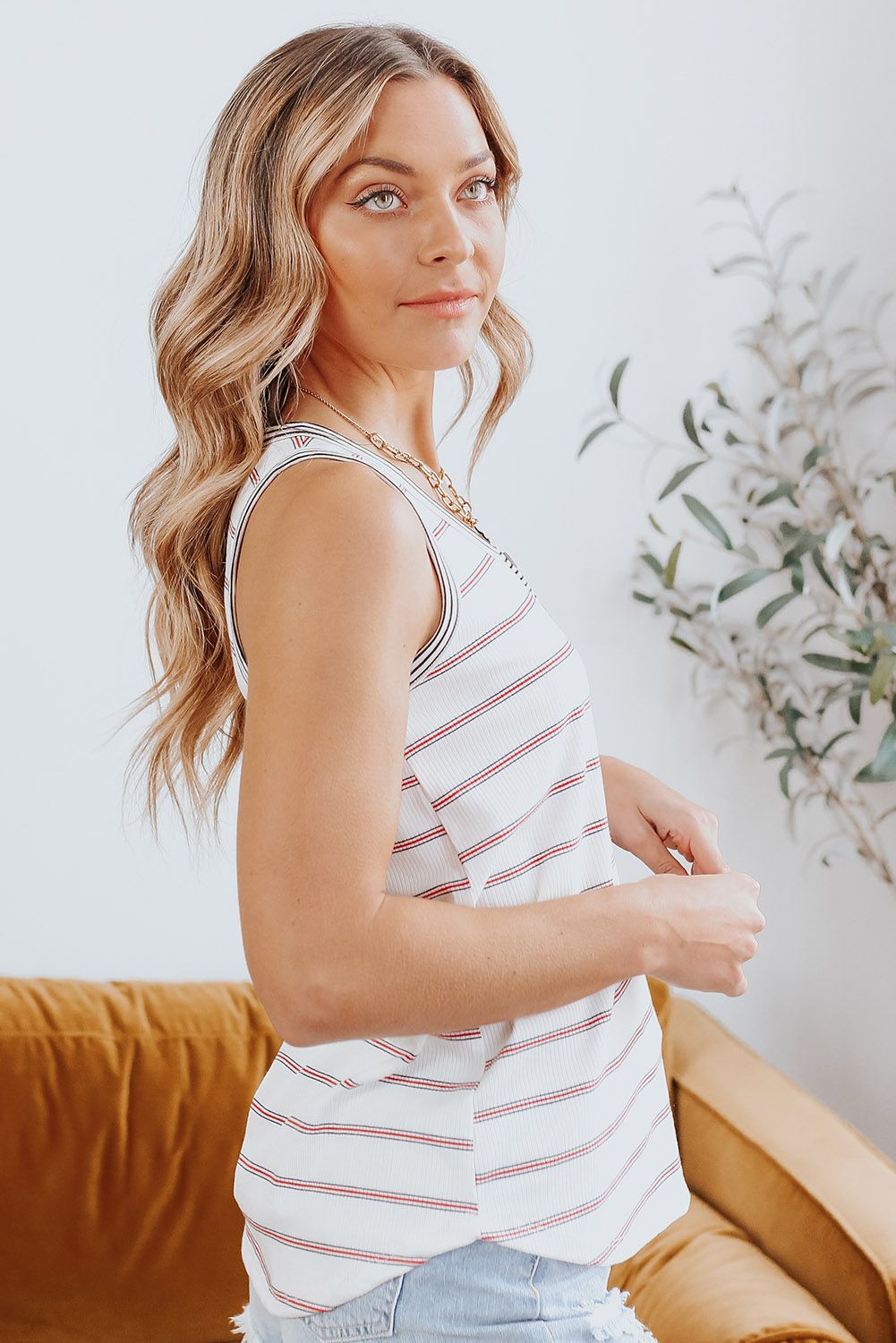 • Just add denim shorts with our Striped Henley Ribbed Tank for the perfect casual look