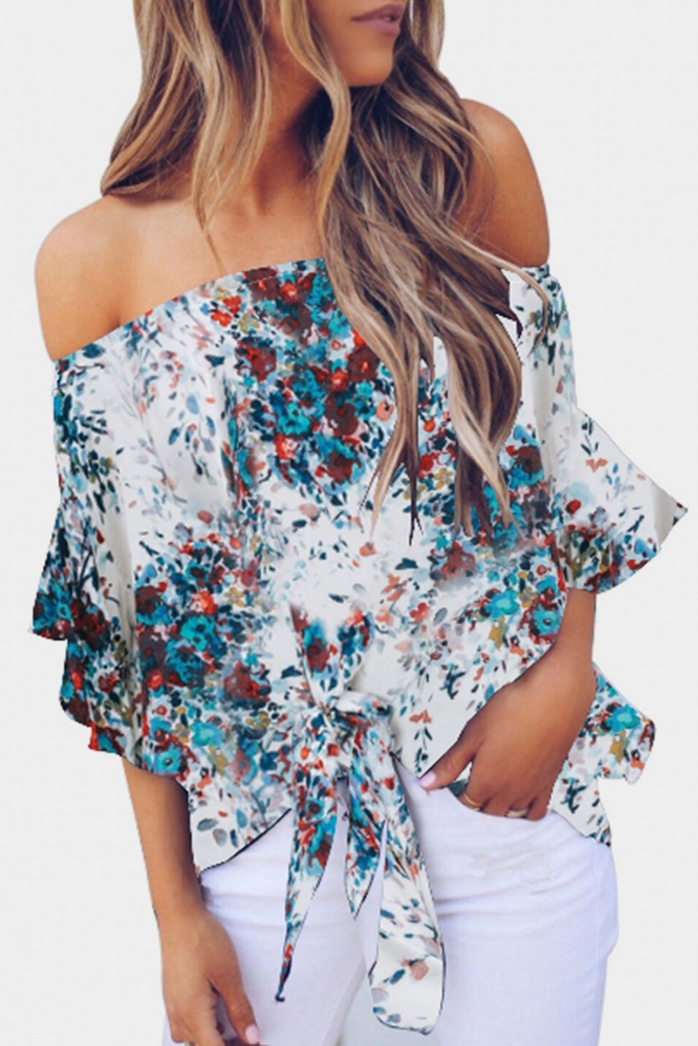 Apricot Off Shoulder Floral Tie Front High Low Chiffon Blouse