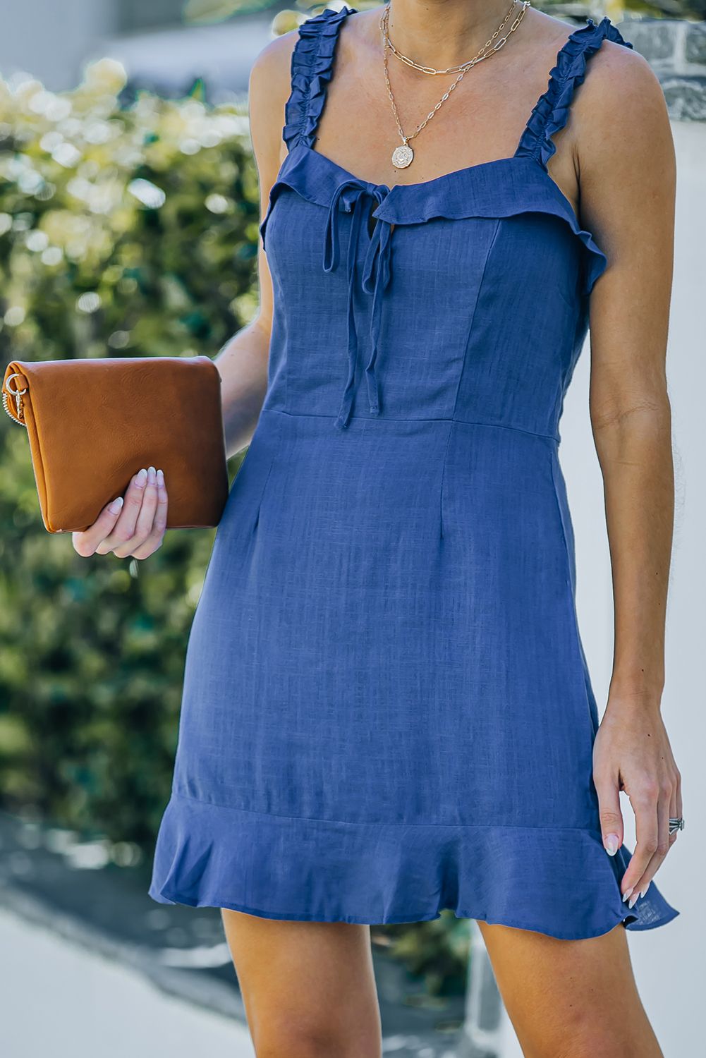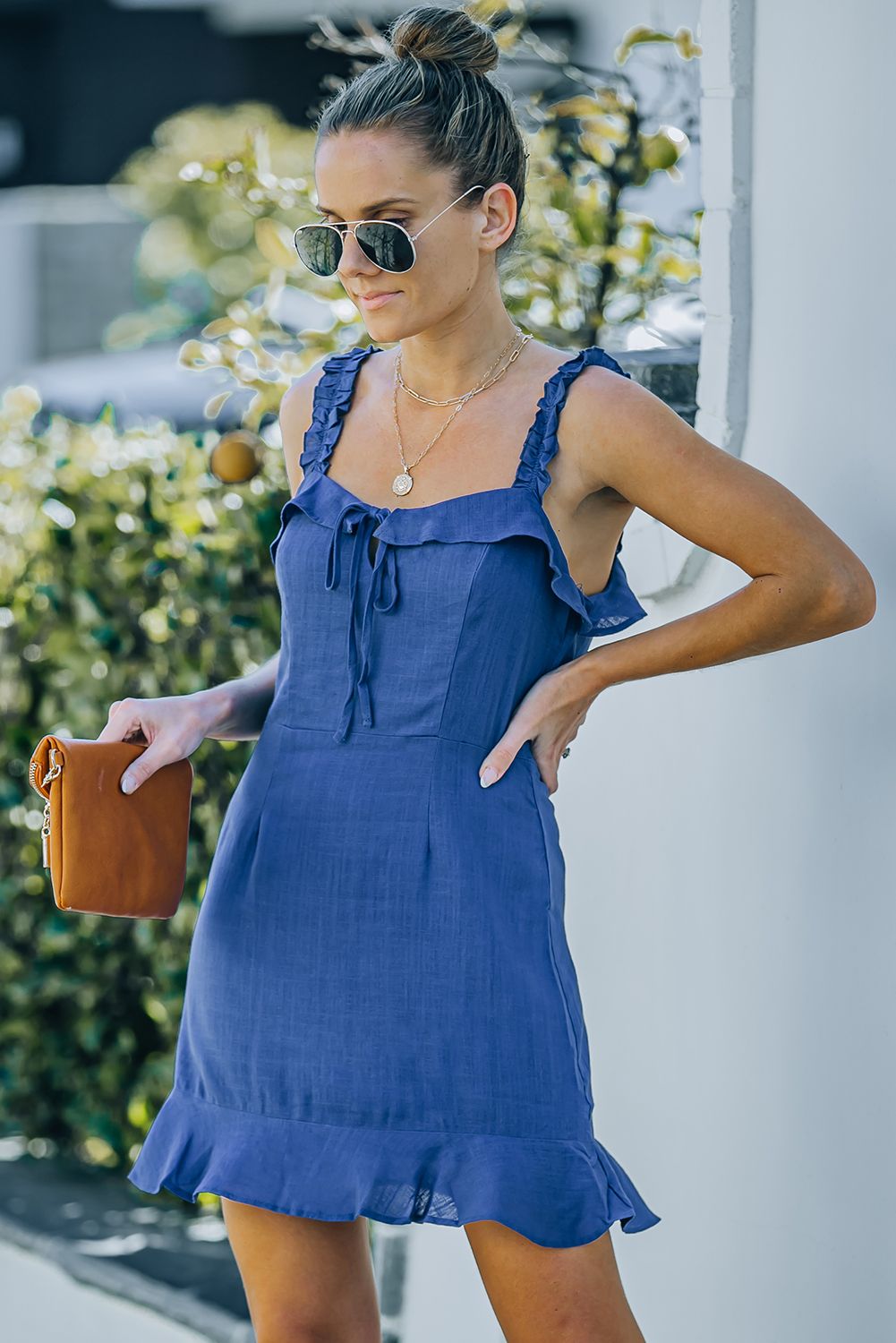 • This blue dress is sweet and sexy with ruffled trim and a revealing design