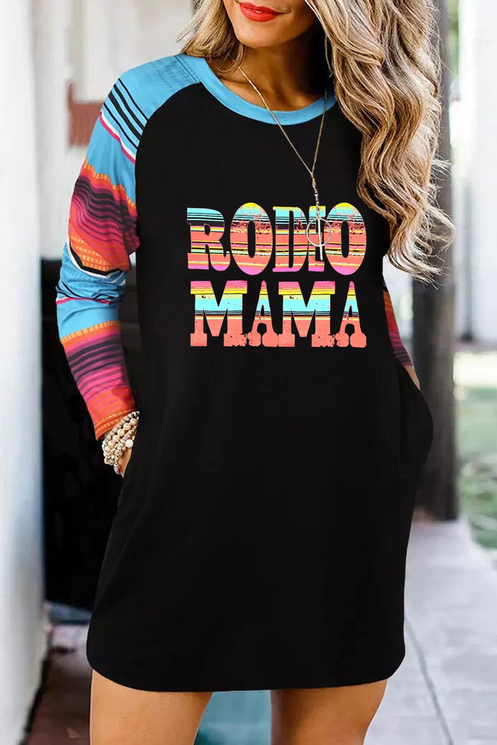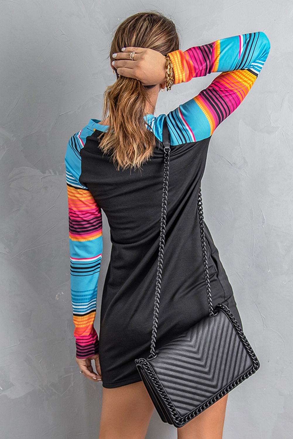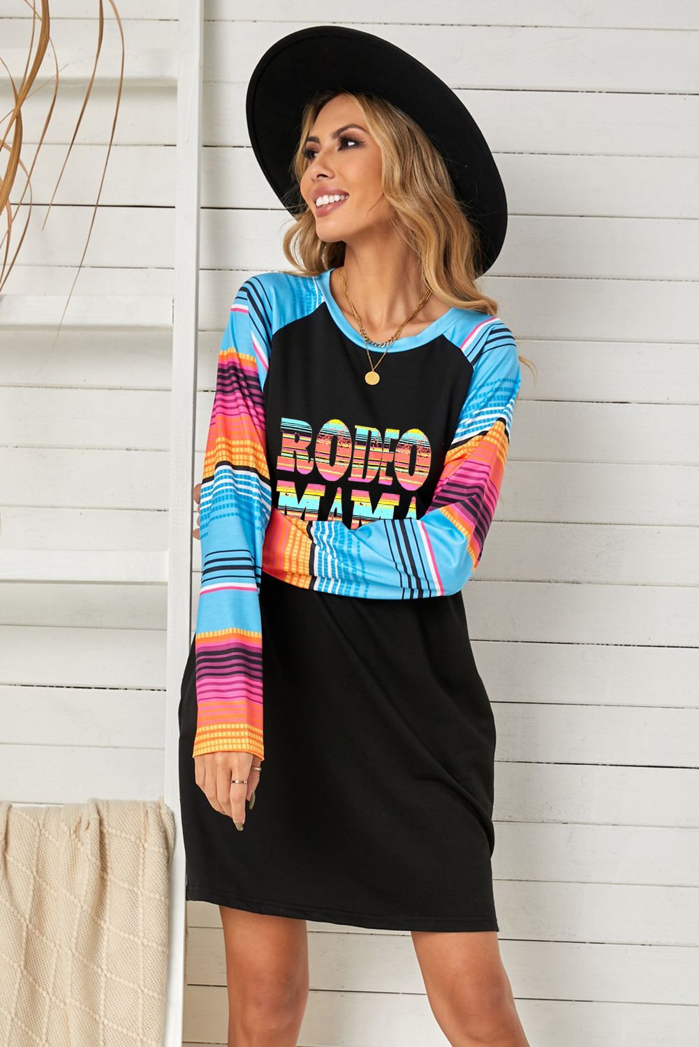 Letter Print Striped Pocket Long Sleeve Shift Mini Dress