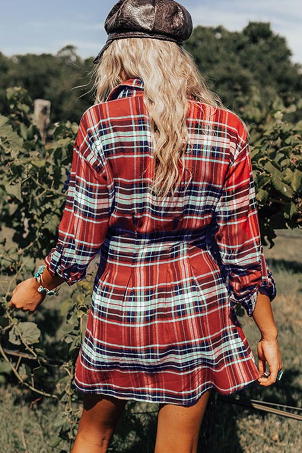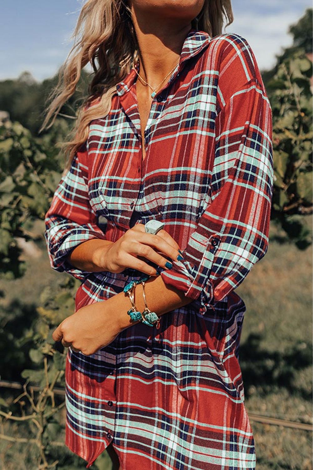 Red Plaid Print Buttoned Long Sleeve Shirt Dress