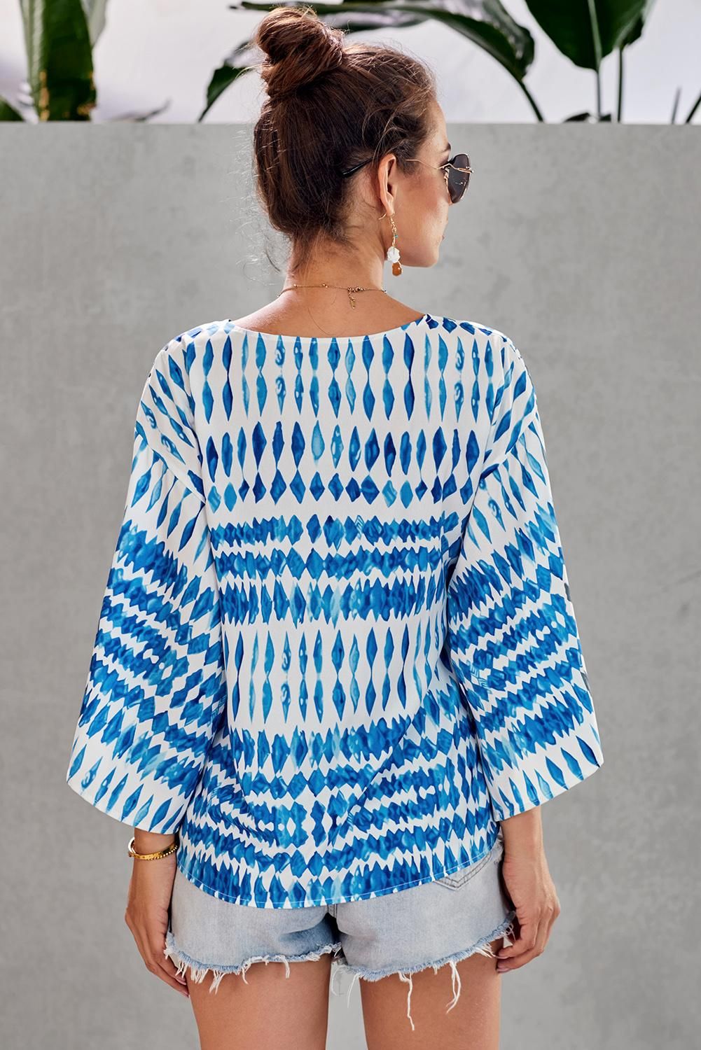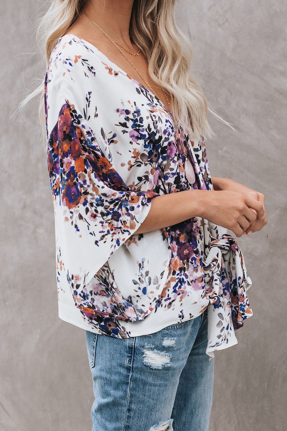 Blue Floral Printed Deep V Neck Tie Front Blouse