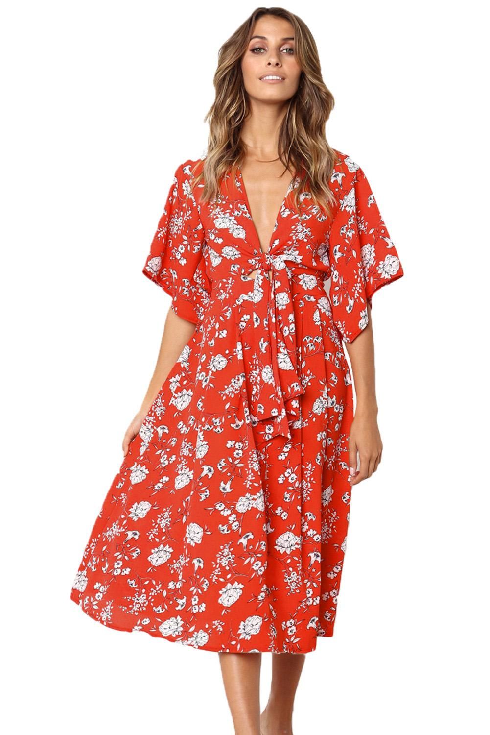 Red Boho Floral Knot Front Kimono Dress