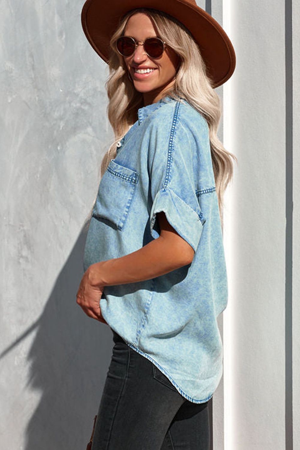 Sky Blue Denim Buttoned Short Sleeve Shirt with Pocket