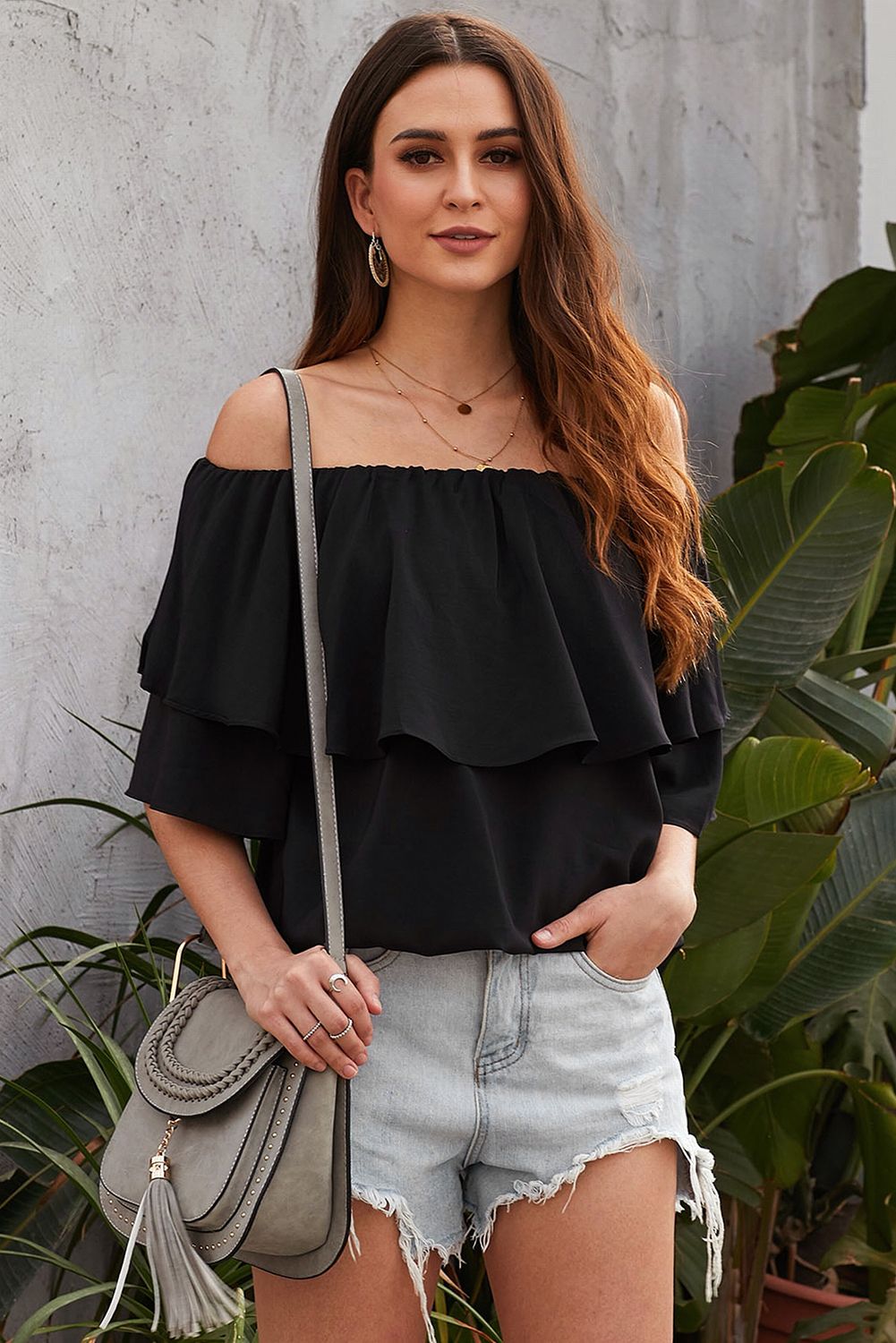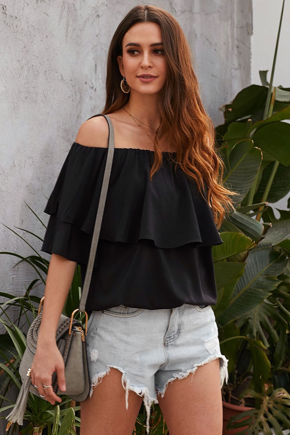 Black Soft Breeze Frilling Off-shoulder Top