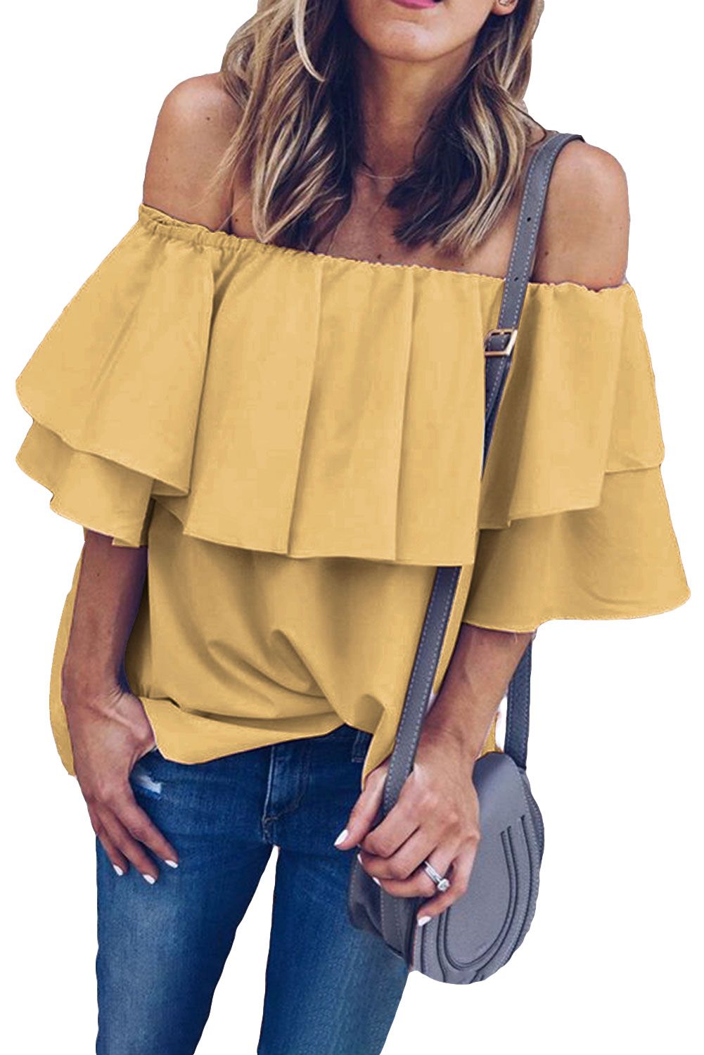 Frilling off-shoulder flap, flare sleeves