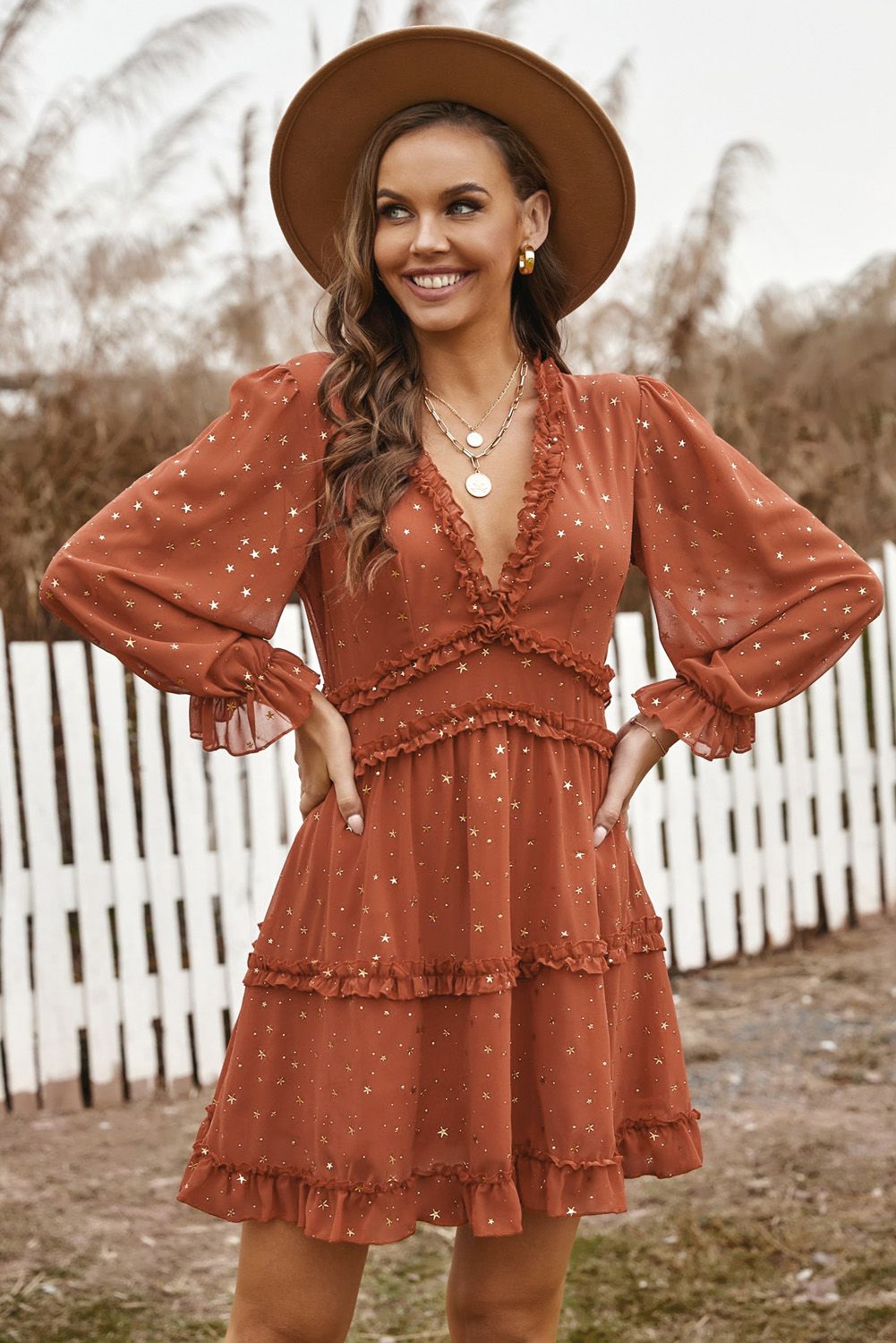 Black Glitter Stars V Neck Backless Ruffle Mini Dress