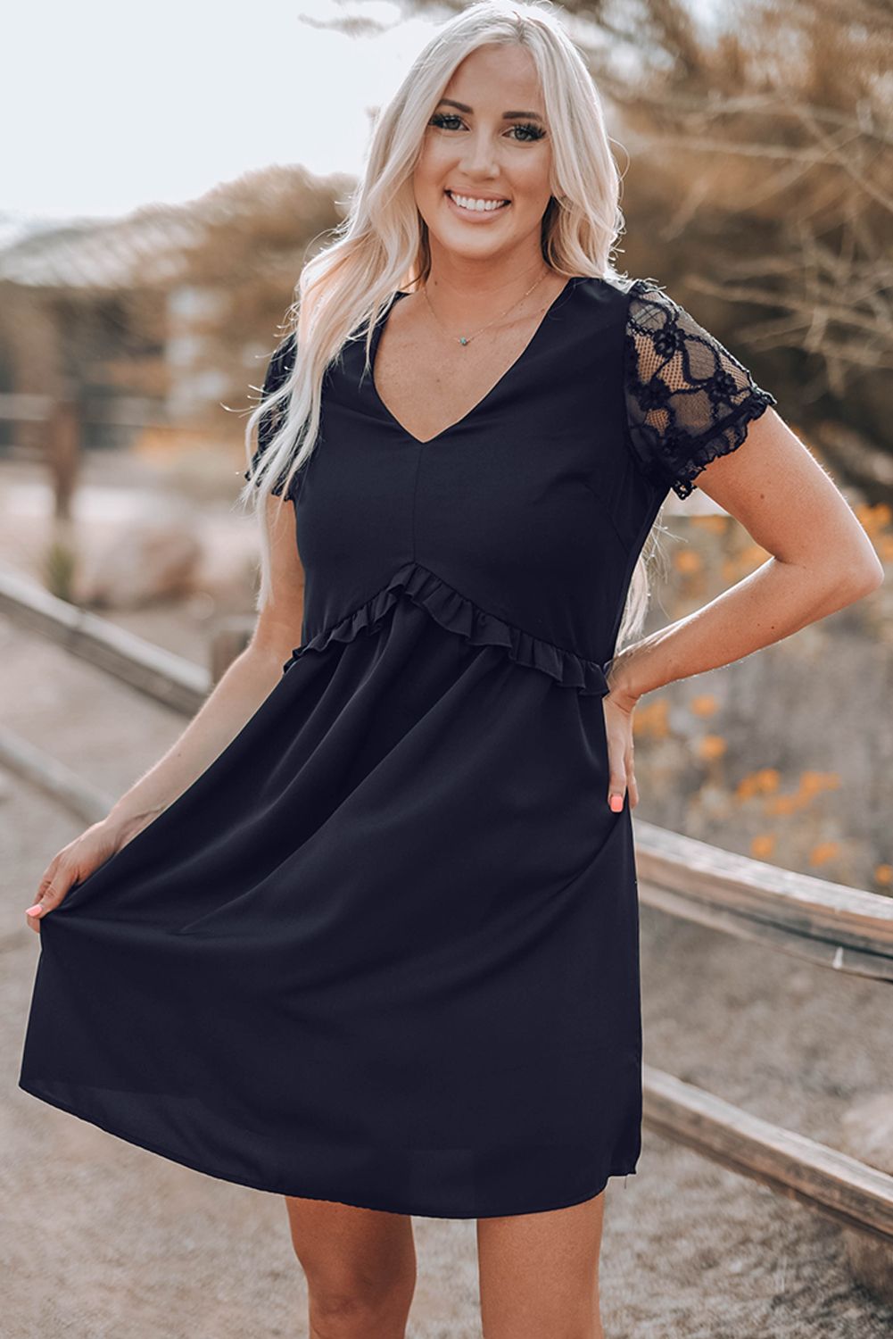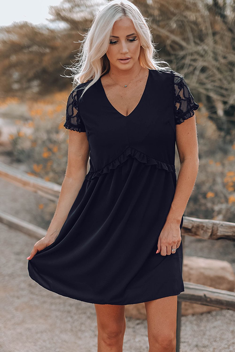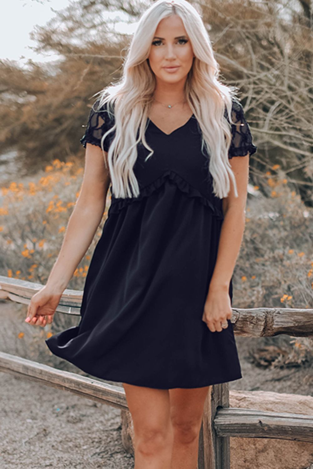 Black Lace Sleeve Frill Trim Smock Dress