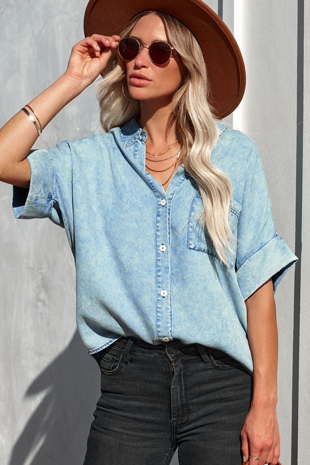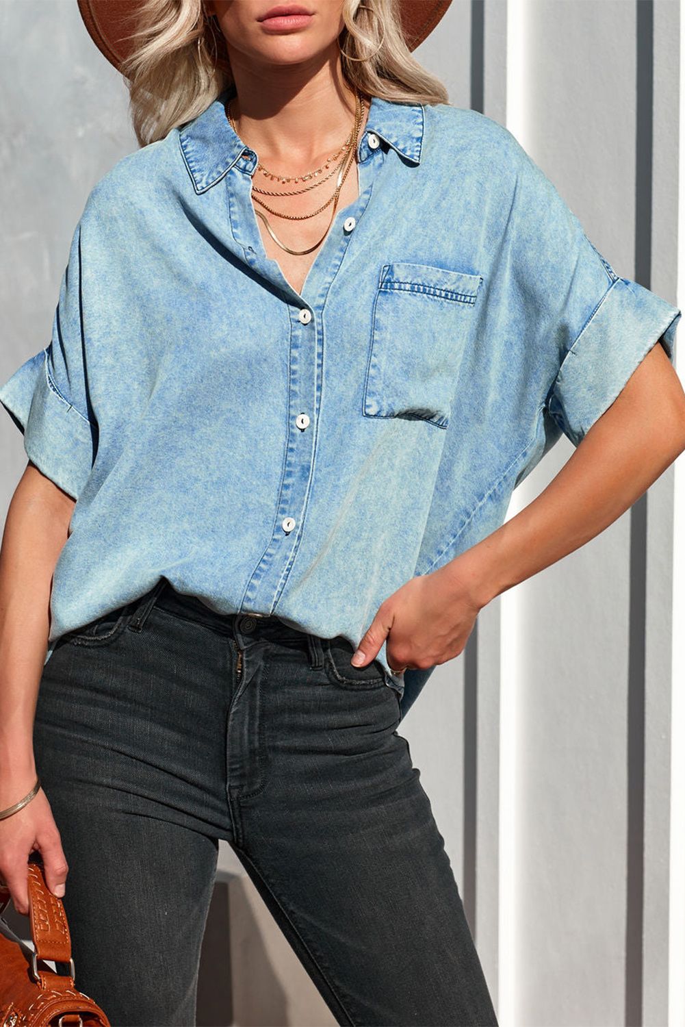 Sky Blue Denim Buttoned Short Sleeve Shirt with Pocket