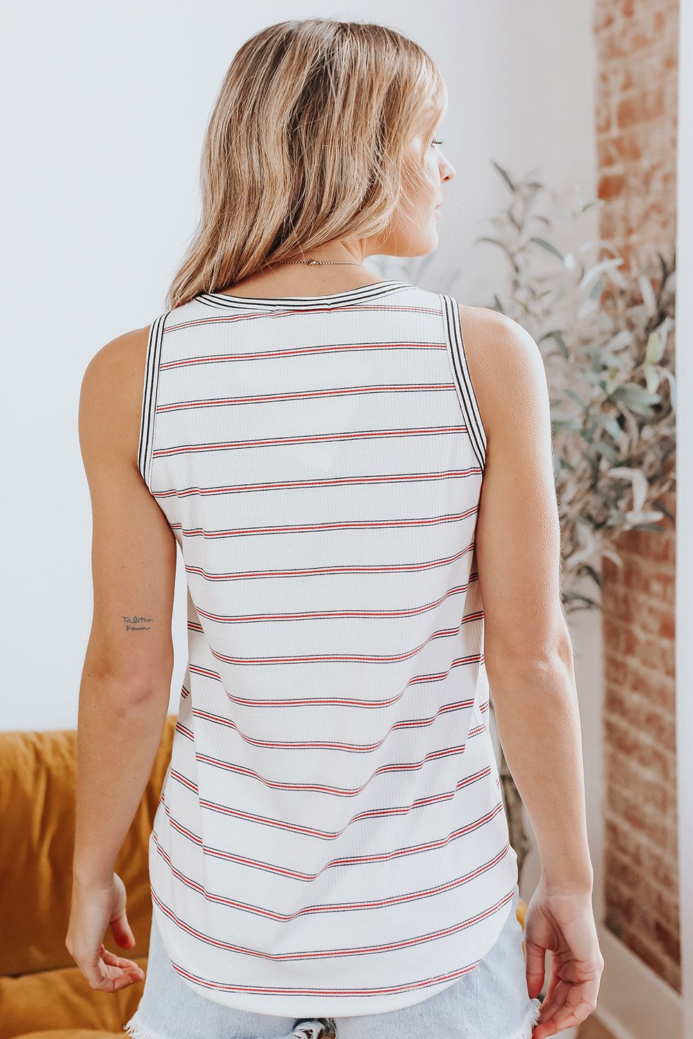 • This striped tank features a round neckline, henley style front, has a contrast striped trim, and comes in a ribbed knit material